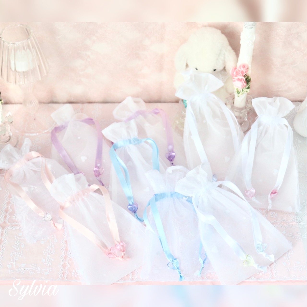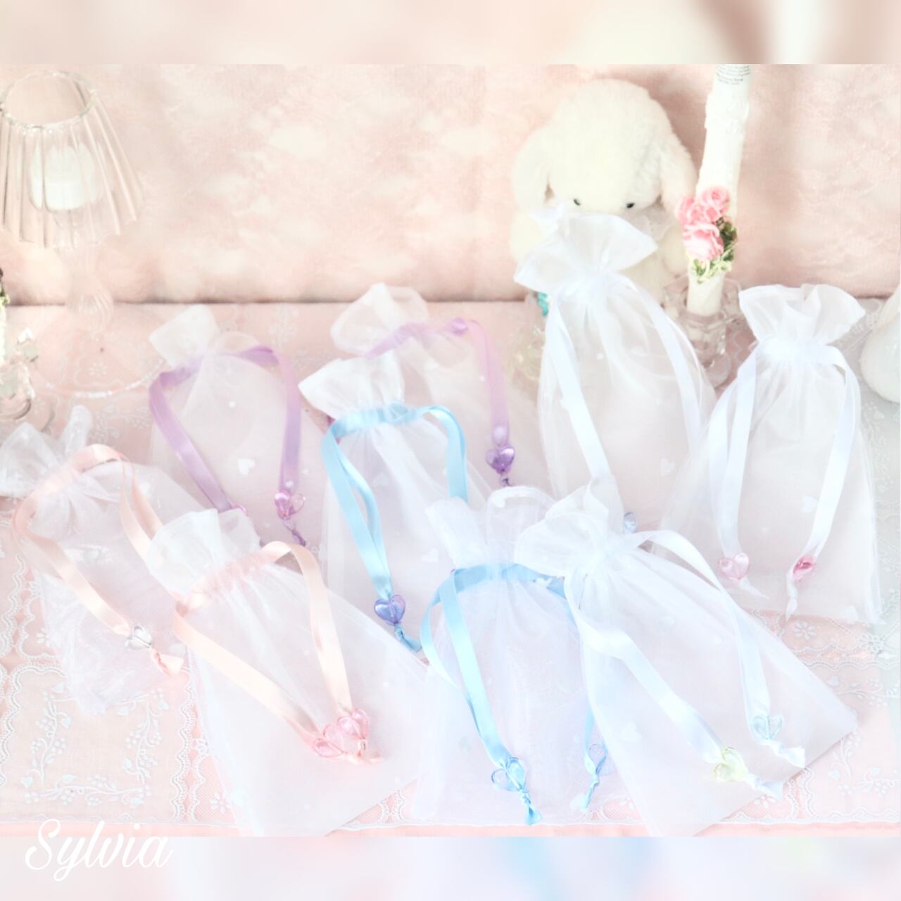 リボンについているハートのビーズの色は Peach Pink. Sky Blue. Lemon Yellow. Lavender Purple. Mint Greenです。