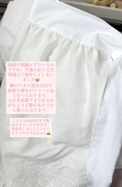 再販分製作時に使用する生地の丈、色を間違えてしまい腰リボン部分は通常の白で、刺繍生地前掛け部分がクリーム色となっております。(画像4枚目)